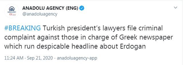 Την είδηση μετέδωσε το τουρκικό κρατικό πρακτορείο ειδήσεων «Anadolu» με ανάρτησή του στο Twitter: