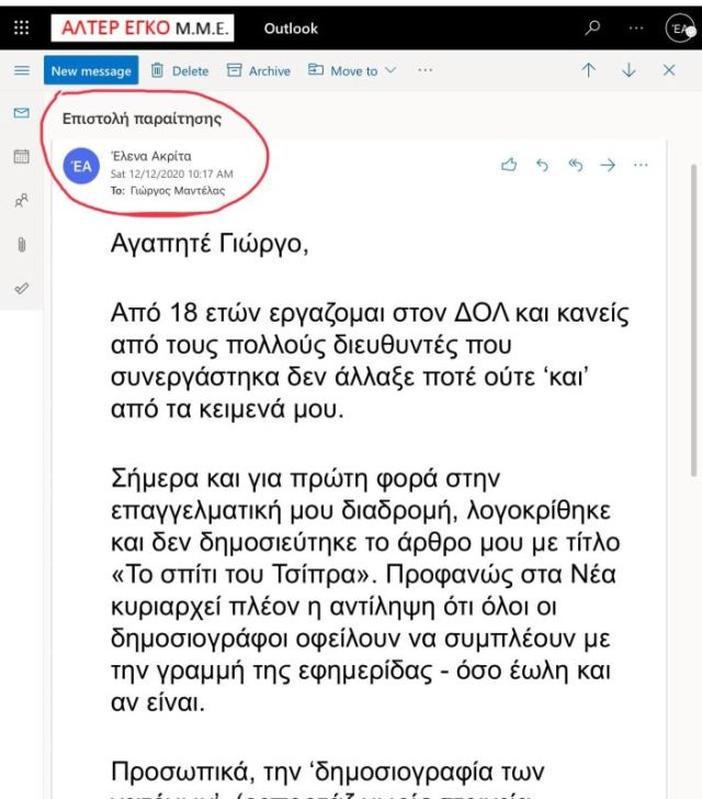 Χτες το πρωί έστειλα επιστολή παραίτησης στον κ. Γιώργο Μαντέλα διευθυντή των Νέων.
