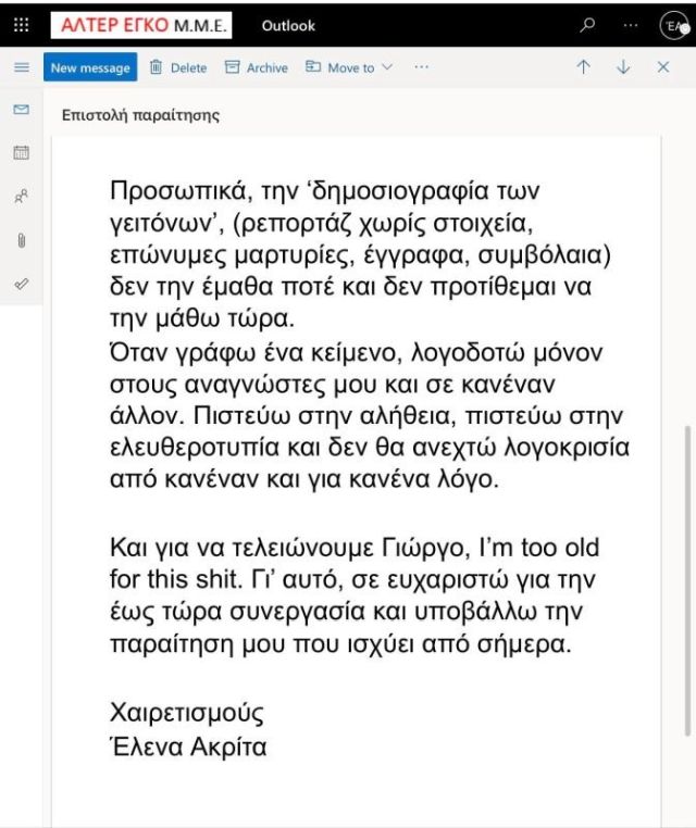 Σήμερα η κα. Ακρίτα επανέρχεται με νέα ανάρτηση η οποία περιέχει και την επιστολή της παραίτησης.