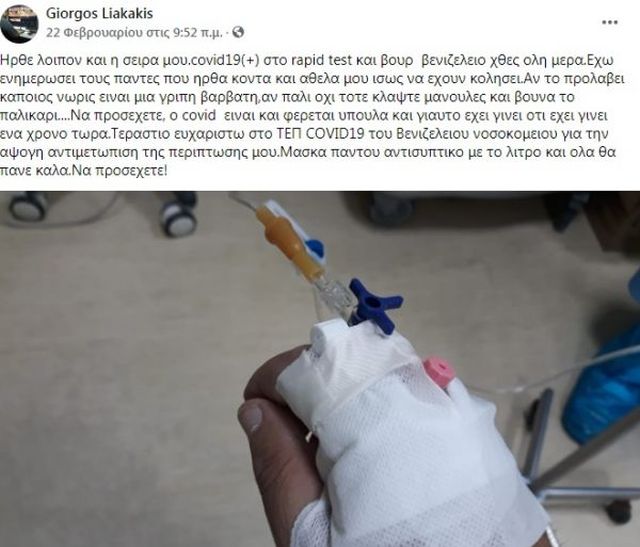 «Ηρθε λοιπον και η σειρα μου. covid19(+) στο rapid test και βουρ βενιζελειο χθες ολη μερα.