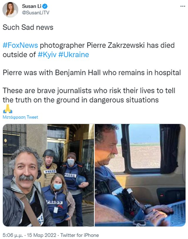 Επίσης, ο δημοσιογράφος του Fox News, Μπέντζαμιν Χολ, τραυματίστηκε την ώρα που συγκέντρωνε πληροφορίες έξω από το Κίεβο.