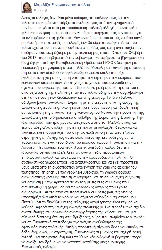 Διαβάστε το πλήρες κείμενο της Μαριλίζας Ξενογιαννακοπούλου όπως αναρτήθηκε στο προφίλ της: