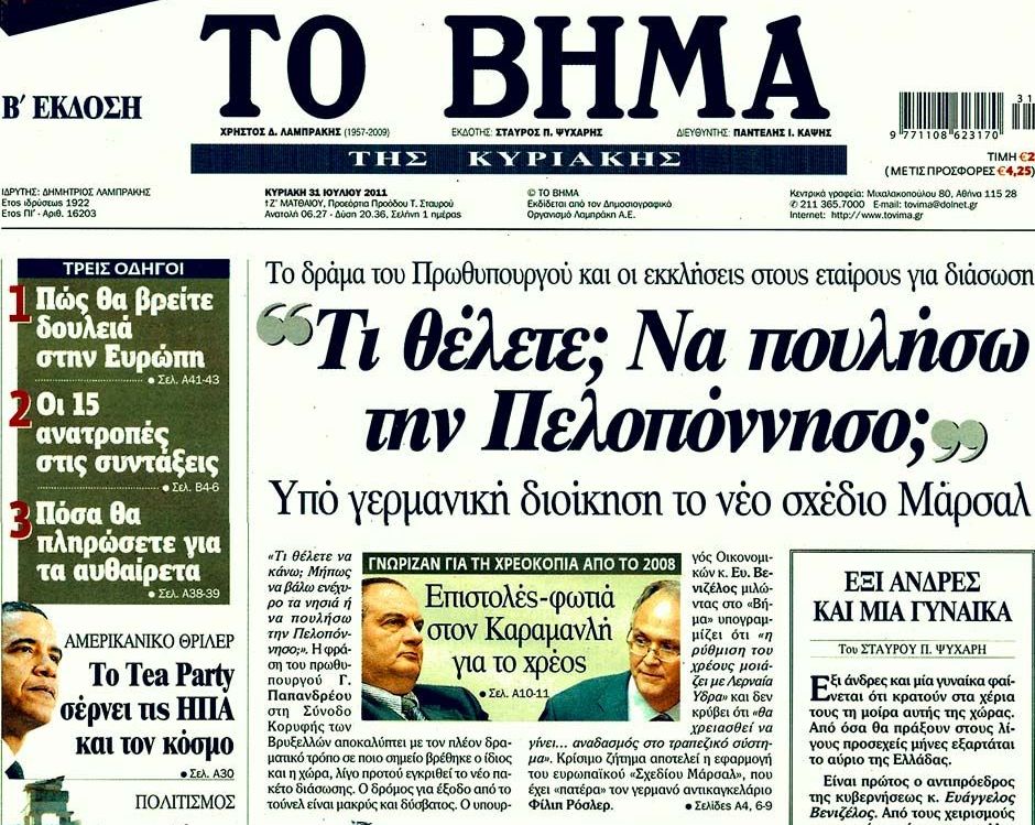 Ακόμα ένα εμετικό μνημονιακό πρωτοσέλιδο του ΒΗΜΑτος, όταν μίλαγε για το “δράμα του Γιώργου Παπανδρέου” και φόβιζε τον ελληνικό λαό ότι θα πουληθεί η Πελοπόννησος.