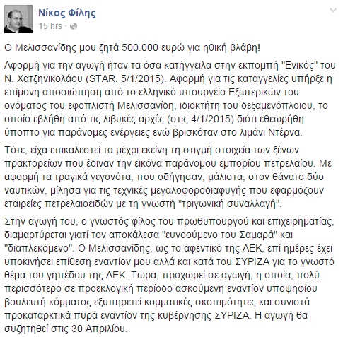 Με ανάρτησή του στη σελίδα του στο Facebook, ο διευθυντής της Αυγής και υποψήφιος του ΣΥΡΙΖΑ στην Α΄Αθήνας, Νίκος Φίλης, γράφει ότι o Δημήτρης Μελισσανίδης του ζητά 500.000 ευρώ για ηθική βλάβη.