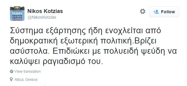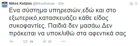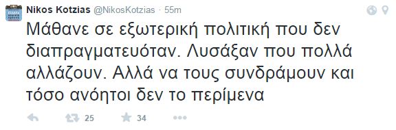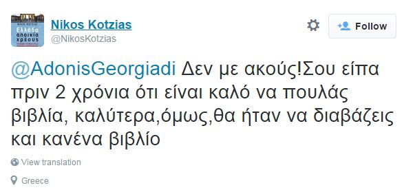 «Δεν με ακούς! Σου είπα πριν 2 χρόνια ότι είναι καλό να πουλάς βιβλία, καλύτερα, όμως, θα ήταν να διαβάζεις και κανένα βιβλίο», ήρθε η αιχμηρή απάντηση του Νίκου Κοτζιά ο οποίος συνέχισε τις αναρτήσεις του σχετικά με την εξωτερική πολιτική διαμηνύοντας ότι «δεν μασάω».
