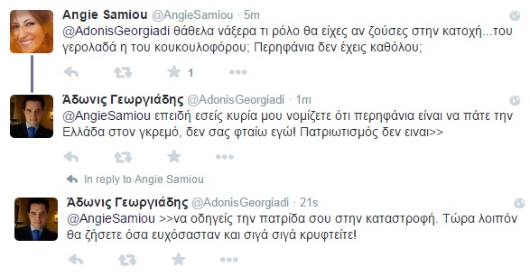 Για μια ακόμη φορά αρπάχτηκαν στο Twitter η Άντζυ Σαμίου με τον Άδωνι Γεωργιάδη. Η δημοφιλής τραγουδίστρια, που τα τελευταία χρόνια blogάρει αντιμνημονιακά, έχει μια “αδυναμία” στον Άδωνι και του την “πέφτει” συχνά. Βεβαίως και ο Άδωνις άλλο που δεν θέλει και κάπου εκεί ξεκινά η “μάχη”.