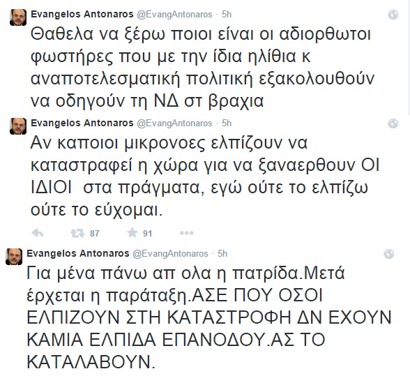 Πυρά εξαπέλυσε από Twitter και Facebook την Κυριακή ο Ευάγγελος Αντώναρος.