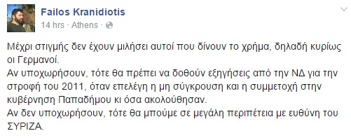 Τώρα ο Φαήλος Κρανιδιώτης ανάρτησε το ακόλουθο στάτους στο προσωπικό του Facebook. Έγραψε: