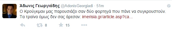 Άρα, για να τα βάζουμε τα πράγματα στη σωστή τους θέση, το παράδειγμα του Άδωνι ήταν για να φοβίσει τον ελληνικό λαό, ενώ ο Κρούγκμαν μάλλον προειδοποιεί τους Γερμανούς ότι θα τιναχτεί η Ευρώπη στον αέρα…