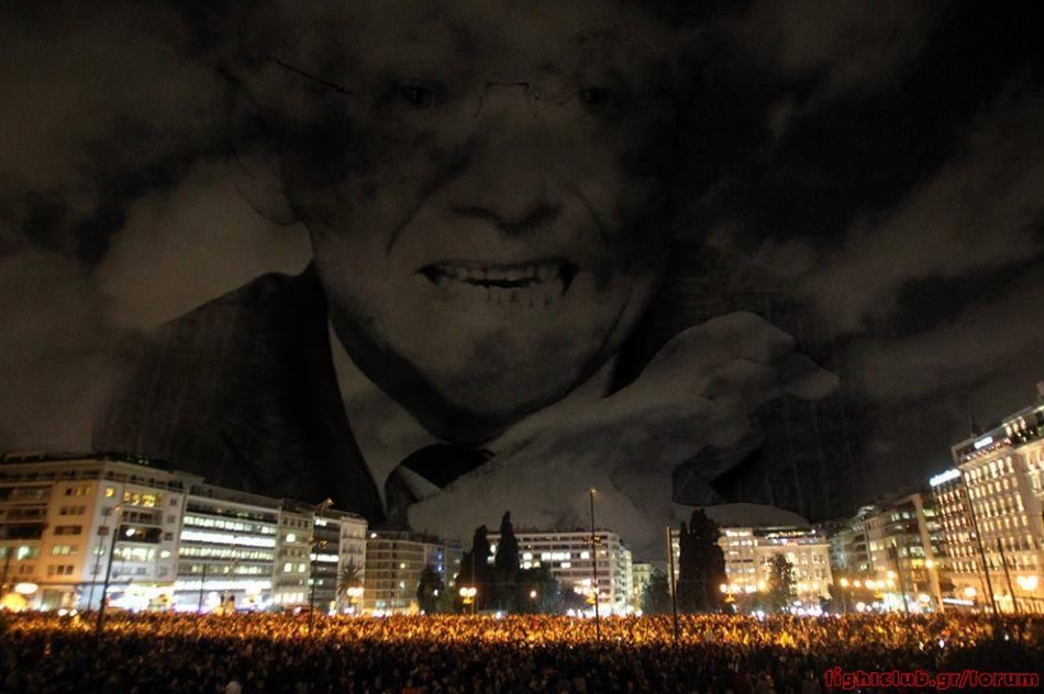 Όπως μπορείτε να δείτε, δείχνει τους Αθηναίους που συγκεντρώθηκαν την Πέμπτη να διαδηλώσουν στην πλατεία Συντάγματος, μπροστά στο μνημείο του Αγνώστου Στρατιώτη και στον νυχτερινό ουρανό της πρωτεύουσας σχηματίζεται η αρπαχτική μορφή του υπουργού Οικονομικών της Γερμανίας.