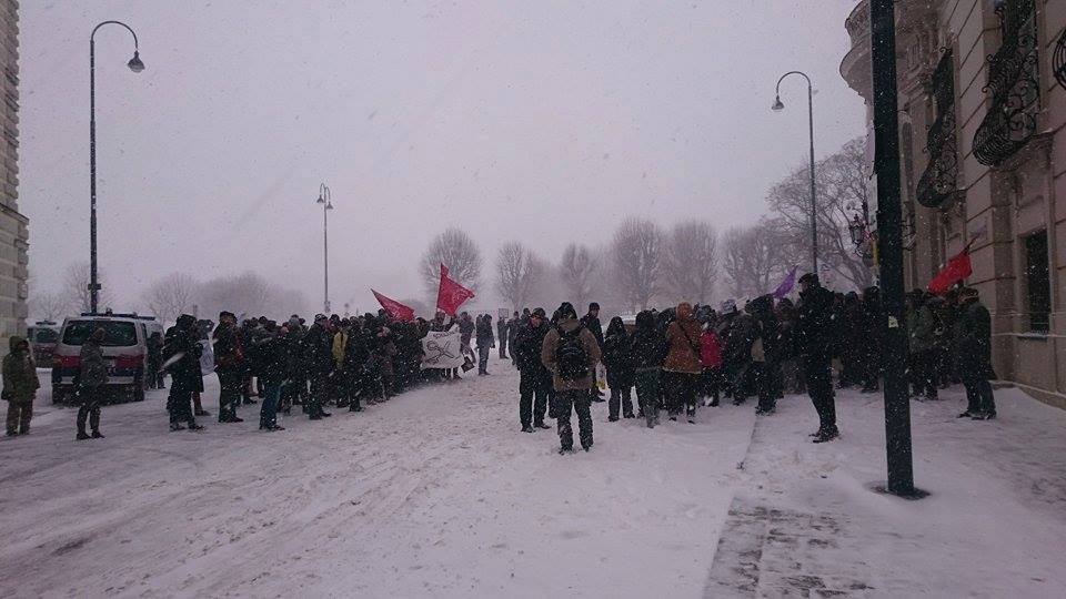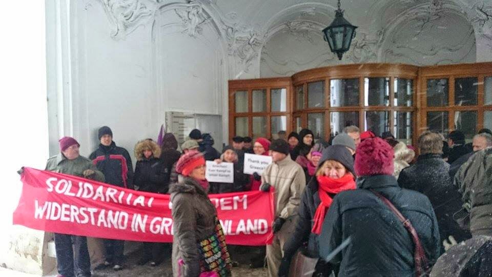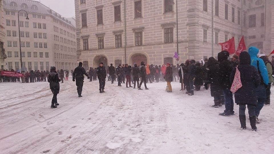 Έντονη ήταν η χιονοθύελλα έξω από την Καγκελαρία της Αυστρίας στη Βιέννη, όπου συναντήθηκε ο Αλέξης Τσίπρας με τον Αυστριακό καγκελάριο, αλλά το χιόνι που έπεφτε πυκνό δεν εμπόδισε αρκετούς πολίτες να διαδηλώσουν την υποστήριξή τους στην Ελλάδα.