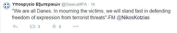 Όπως χαρακτηριστικά αναφέρεται και σε ανάρτηση του υπουργείου Εξωτερικών στο Twitter, ο κ. Κοτζιάς είπε πως «είμαστε όλοι Δανοί» και ότι «θα υπερασπιστούμε την ελευθερία της έκφρασης από τις τρομοκρατικές απειλές».