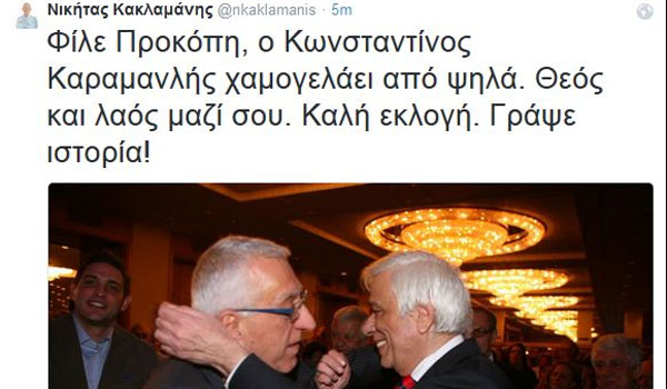 «Φίλε Προκόπη, ο Κωνσταντίνος Καραμανλής χαμογελάει από ψηλά. Θεός και λαός μαζί σου. Καλή εκλογή. Γράψε ιστορία!», ήταν το σχόλιο του βουλευτή της Νέας Δημοκρατίας, που ανέβασε μια παλαιότερη φωτογραφία στην οποία έχει έναν εναγκαλισμό με τον Προκόπη Παυλόπουλο.