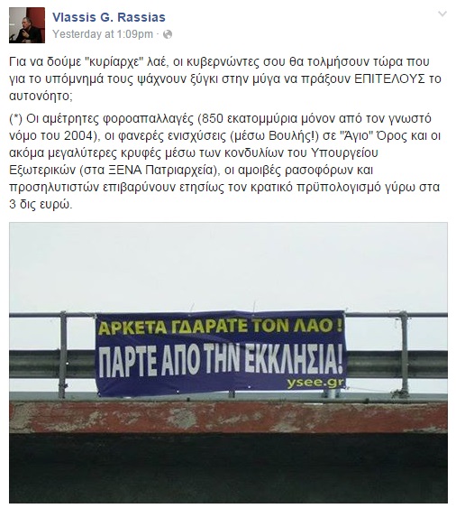 (*) Οι αμέτρητες φοροαπαλλαγές (850 εκατομμύρια μόνον από τον γνωστό νόμο του 2004), οι φανερές ενισχύσεις (μέσω Βουλής!) σε “Άγιο” Όρος και οι ακόμα μεγαλύτερες κρυφές μέσω των κονδυλίων του Υπουργείου Εξωτερικών (στα ΞΕΝΑ Πατριαρχεία), οι αμοιβές ρασοφόρων και προσηλυτιστών επιβαρύνουν ετησίως τον κρατικό πρϋπολογισμό γύρω στα 3 δισ. ευρώ”.