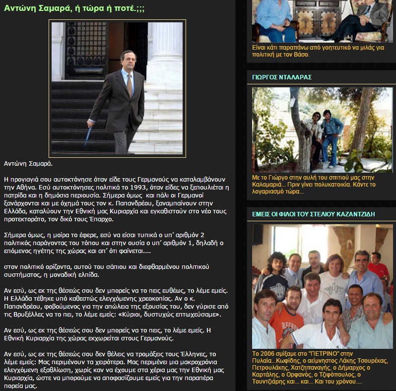 Ακόμα, με άρθρα άλλων που ωστόσο αναρτούσε στο προσωπικό του ιστολόγιο, παρότρυνε τη ΝΔ να κάνει αντιπολίτευση Γιατί δεν κάνει αντιπολίτευση η ΝΔ; (2 Οκτωβρίου 2011), έλεγε στον Αντώνη Σαμαρά να ξυπνήσει Αντώνη Σαμαρά επιτέλους ξύπνα (26 Σεπτεμβρίου 2011) και άλλα πολλά, μιας και φρόντιζε να σηκώνει όλα τα άρθρα που του άρεσαν από το Antinews κι άλλα σαμαρικά σάιτ και blog.