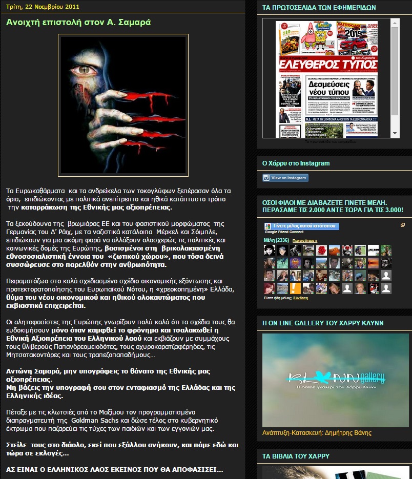 “Αντώνη Σαμαρά, μην υπογράφεις το θάνατο της Εθνικής μας αξιοπρέπειας. Μη βάζεις την υπογραφή σου στον ενταφιασμό της Ελλάδας και της Ελληνικής ιδέας. Πέταξε με τις κλωτσιές από το Μαξίμου τον προγραμματισμένο διαπραγματευτή της Goldman Sachs και δώσε τέλος στο κυβερνητικό έκτρωμα που παζαρεύει τις τύχες των παιδιών και των εγγονιών μας. Στείλε τους στο διάολο, εκεί που εξάλλου ανήκουν, και πάμε εδώ και τώρα σε εκλογές… ΑΣ ΕΙΝΑΙ Ο ΕΛΛΗΝΙΚΟΣ ΛΑΟΣ ΕΚΕΙΝΟΣ ΠΟΥ ΘΑ ΑΠΟΦΑΣΙΣΕΙ… Βασίλης Ν. Τριανταφυλλίδης (Χάρρυ Κλυνν)”.