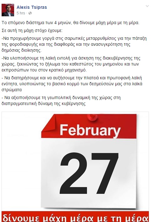 Το βράδυ της Πέμπτης , λίγη ώρες μετά την συνεδρίαση της Πολιτικής Γραμματείας του ΣΥΡΙΖΑ, όπου έγινε εκτενής συζήτηση για τη νέα συμφωνία και τις διαπραγματεύσεις με τους δανειστές, ο κ. Τσίπρας ανάρτησε στον γνωστό ιστότοπο κοινωνικής δικτύωσης μια φωτογραφία από το ημερολόγιο και αναφέρθηκε στη μάχη που δίνει η κυβέρνησης και τους στόχους της.
