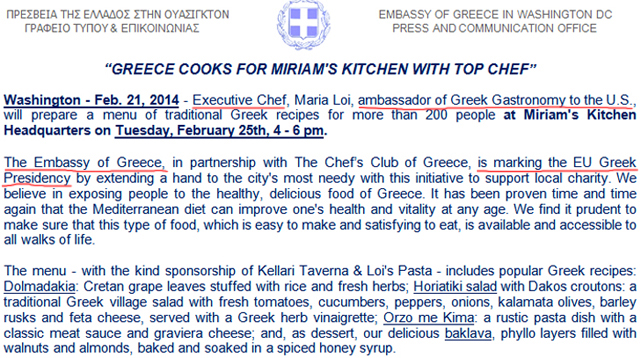 Το δημοσίευμα είναι της ηλεκτρονικής ομογενειακής εφημερίδας “Το ΚΑΛΑΜΙ”, γνωστή για τον καυστικό της λόγο, από την οποία πληροφορούμαστε ότι “Η πρεσβεία – “γιαλαντζί” (στην Ουάσιγκτον) “εγκαινιάζει την ελληνική προεδρία στην Ευρωπαϊκή “Ενωση”, με dolmadakia, xoriatikh salad, orzo me kima, baklava σε… “Οίκημα Αστέγων”.”.