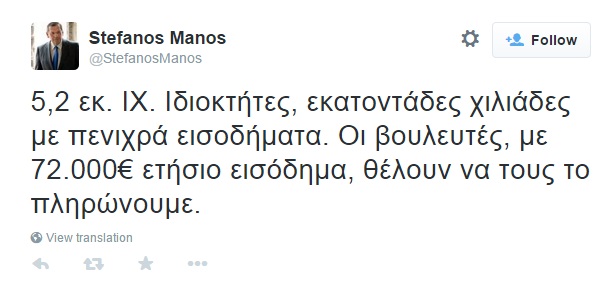 Τα “ριξε” μέσω Twitter ο Στέφανος Μάνος στους βουλευτές που έχουν την απαίτηση βουλευτικού αυτοκίνητου, με άλλα λόγια αυτοκίνητου που το πληρώνει ο ελληνικός λαός.