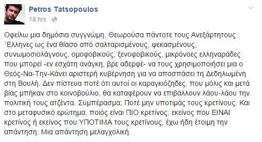 «Οφείλω μια δημόσια συγγνώμη. Θεωρούσα πάντοτε τους Ανεξάρτητους ΄Ελληνες ως ένα θίασο από σαλταρισμένους, ψεκασμένους, συνωμοσιολάγνους, ομοφοβικούς, ξενοφοβικούς, μικρόνοες ελληναράδες που μπορεί -εν εσχάτη ανάγκη, βρε αδερφέ- να τους χρησιμοποιήσει μια ο Θεός-Να-Την-Κάνει αριστερή κυβέρνηση για να αποσπάσει τη Δεδηλωμένη στη Βουλή.