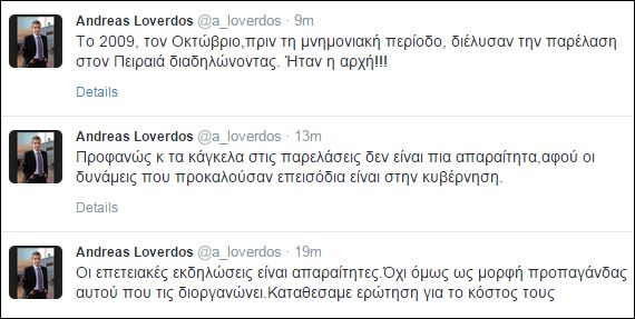 “Προφανώς και τα κάγκελα στις παρελάσεις δεν είναι πια απαραίτητα, αφού οι δυνάμεις που προκαλούσαν επεισόδια είναι στην κυβέρνηση” έγραψε στο λογαριασμό του στο twitter.