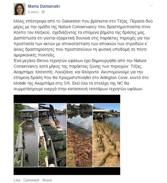 Διαπίστωσα ότι γίνεται εξαιρετική δουλειά στις παράκτιες περιοχές για την προστασία των ακτών με αποκατάσταση των αποικιών των στρειδιών κ’ άλλες δραστηριότητες που προστατεύουν τη φυσική υποδομή σε πέντε αμερικανικές πολιτείες.