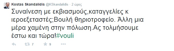 Όπως για παράδειγμα ο Κώστας Σκανδαλίδης, που σχολίασε τις “μάχες” ΣΥΡΙΖΑ – ΝΔ στο Twitter με το ακόλουθο σχόλιο: