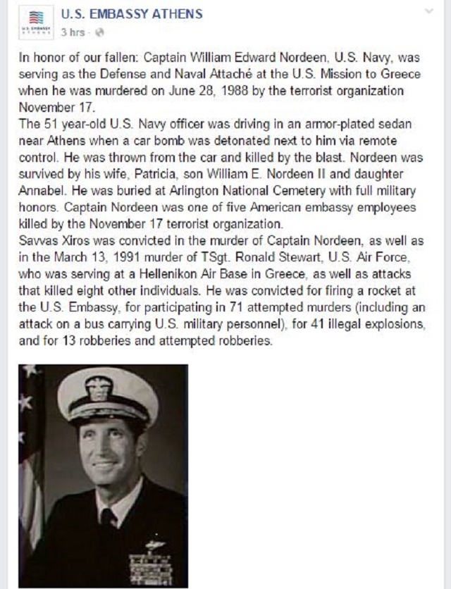 Συγκεκριμένα, η Πρεσβεία των ΗΠΑ στην Αθήνα ανάρτησε κείμενο σχετικά με τη δολοφονία από την «17 Νοέμβρη» του Αμερικανού πλοιάρχου Ουίλιαμ Έντουαρντ Νορντίν και τις κατηγορίες που αντιμετωπίζει ο Σάββας Ξηρός.