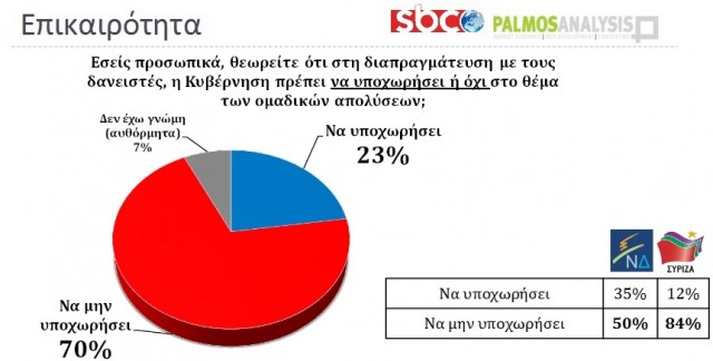 Αναλυτικότερα το 70% των ερωτηθέντων καλεί την κυβέρνηση να μην υποχωρήσει στο θέμα των ομαδικών απολύσεων.