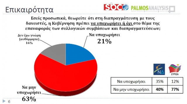 Επίσης το 63% των εωβτηθέντων δηλώνει ότι η κυβέρνηση δεν πρέπει να υποχωρήσει στο ζήτημα της επαναφοράς των συλλογικών συμβάσεων.