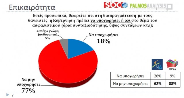 Ωστόσο η δημοσκόπηση αυτή πρέπει να προβληματίσει όχι μόνο την κυβέρνηση, αλλά όλα τα πολιτικά κόμματα, καθώς σχεδόν 7 στους 10 Έλληνες ζητούν από την κυβέρνηση τους – και προφανώς στέλνουν μήνυμα και προς την αντιπολίτευση- να μην κάνει πίσω στις «κόκκινες γραμμές» της, όπως τα εργασιακά, οι ομαδικές απολύσεις και το ασφαλιστικό.