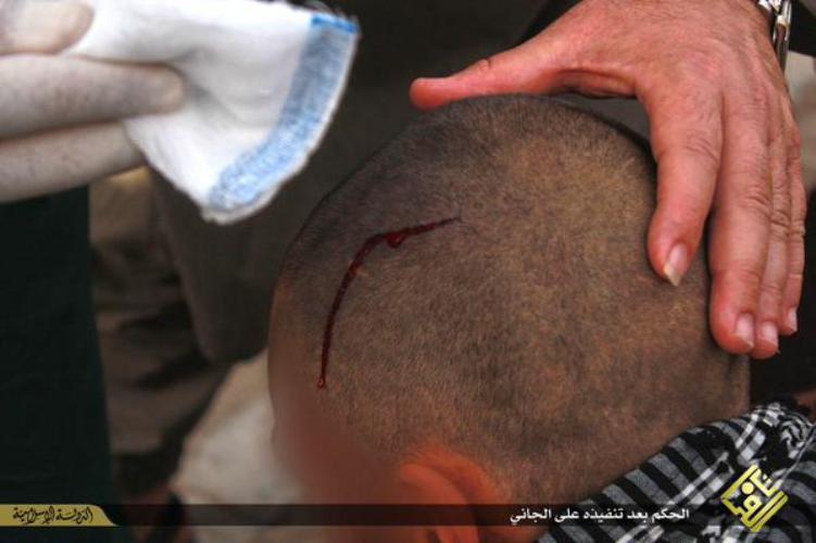 Στη συνέχεια ένας τζιχαντιστής πήρε έναν χάρακα (μάλιστα έναν χάρακα) και μέτρησε ακριβώς πάνω στα κεφάλια των υπαίτιων το μήκος του τραύματος που είχαν προκαλέσει στο τρίτο παιδί. Στο ίδιο σημείο και στο ίδιο σχήμα.