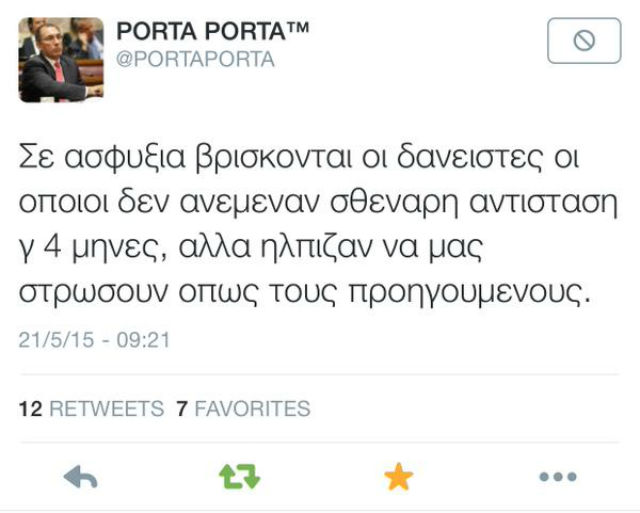 Στο τουίτ του ο κ. Καμμένος αναφέρει ότι οι δανειστές βρίσκονται σε ασφυξία και κάνει την εξής ανάλυση: