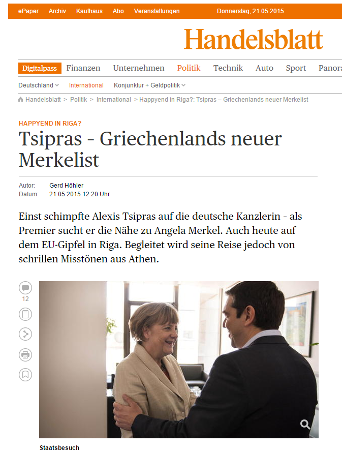«Ως ηγέτης της ελληνικής αντιπολίτευσης ο Αλέξης Τσίπρας είχε δαιμονοποιήσει τη Γερμανίδα καγκελάριο ως “την πιο επικίνδυνη πολιτικό στην Ευρώπη” και μάλιστα είχε χαρακτηρίσει τον προκάτοχό του, Αντώνη Σαμαρά, ως “μερκελιστή” που λαμβάνει οδηγίες από το Βερολίνο. Όταν όμως ανέλαβε τον πρωθυπουργικό θώκο, ο Αλέξης Τσίπρας άρχισε να καλλιεργεί καλές σχέσεις με την Γερμανίδα καγκελάριο», υποστηρίζει η εφημερίδα Handelsblatt και προσθέτει: «Κάθε εβδομάδα, οι δύο τους έχουν πολλές φορές τηλεφωνική επικοινωνία.