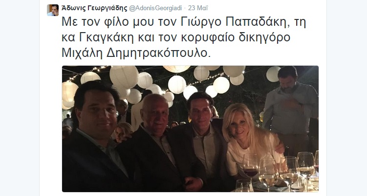 Το ξανασμίξιμο “κάρφωσε” ο ίδιος ο Άδωνις Γεωργιάδης με φωτογραφία που ανάρτησε στο Twitter από νυχτερινή έξοδο του ίδιου, με τον Γιώργο Παπαδάκη στο πλευρό του, ενώ παραδίπλα κάθονται ο δικηγόρος Μιχάλης Δημητρακόπουλος και η Κατερίνα Γκαγκάκη.