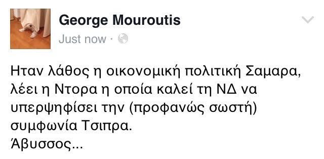 Τον πόλεμο «άνοιξε» ποστ στον προσωπικό του λογαριασμό στο Facebook, με το οποίο ο πρώην υπεύθυνος γραφείου τύπου του πρωθυπουργικού γραφείου του Αντώνη Σαμαρά πετάει το γάντι στην Ντόρα Μπακογιάννη…