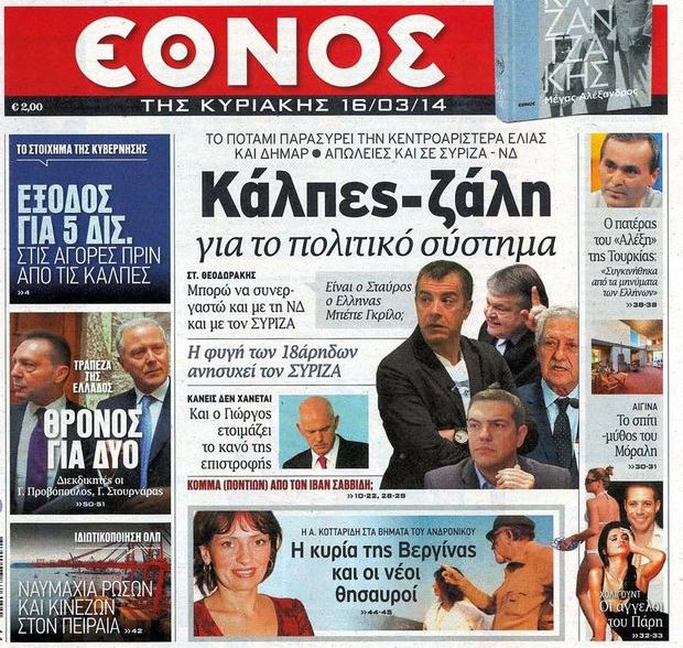 Με πρωτοσέλιδό της στην κυριακάτικη έκδοσή της η εφημερίδα έχει βάλει την τρόμπα μπροστά και φουσκώνει: “Το Ποτάμι παρασύρει την Κεντροαριστερά Ελιάς και ΔΗΜΑΡ – Απώλειες σε ΣΥΡΙΖΑ και ΝΔ – Κάλπες ζάλη για το πολιτικό σύστημα – Στ. Θεοδωράκης: Μπορώ να συνεργαστώ και με τη ΝΔ και με τον ΣΥΡΙΖΑ” και περισσότερο… εμετός δεν γίνεται, σχολιάζουμε με τη σειρά μας.