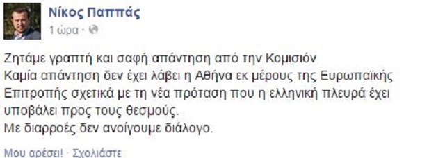 «Ζητάμε γραπτή και σαφή απάντηση από την Κομισιόν», λέει ο υπουργός Επικρατείας Νίκος Παππάς μέσα από την σελίδα του στο Facebook.