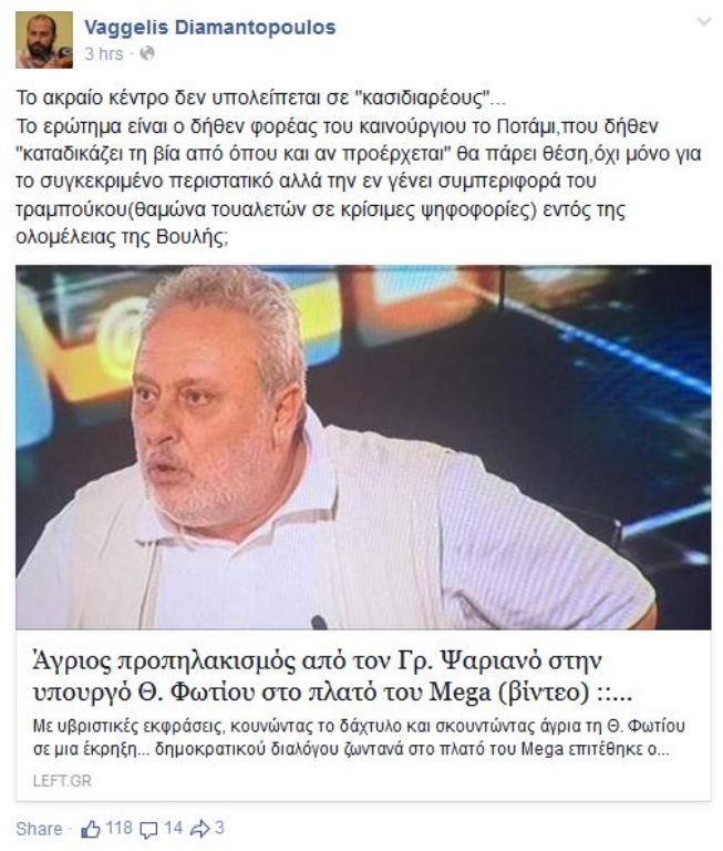 Λίγες ώρες μετά τον καβγά του βουλευτή του Πουταμιού με την αναπληρώτρια υπουργό Κοινωνικής Αλληλεγγύης, Θεανώ Φωτίου στο πλατό της τηλεοπτικής εκπομπής του Alpha «Ίντριγκα», ο κ Διαμαντόπουλος χώθηκε στον καβγά γράφοντας στο Facebook: