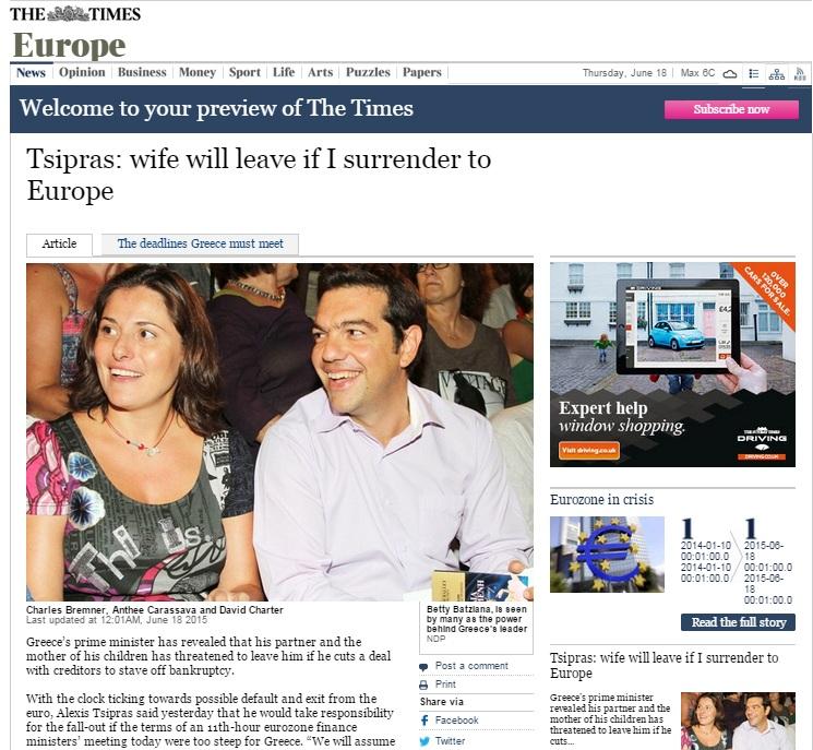 Σύμφωνα με το δημοσίευμα ο Αλέξης Τσίπρας, φέρεται να έχει αποκαλύψει ότι, εάν κάνει πίσω στη διαπραγμάτευση και καταφύγει σε «αναγκαστική» συμφωνία με τους δανειστές, προκειμένου να αποφύγει τη χρεοκοπία, η σύντροφός του και «πρώτη κυρία», Μπέττυ Μπαζιάνα, έχει απειλήσει ότι θα τον… αφήσει.