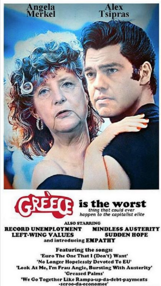 Στις παρακάτω φωτογραφίες η Άνγκελα Μέρκελ παίρνει τον ρόλο του Αλέξη Τσίπρα, ενώ σε κάποια άλλη οι δύο ηγέτες έχουν μεταμορφωθεί στους πρωταγωνιστές της γνωστής ταινίας «Grease», με την Μέρκελ στον ρόλο της Ολίβια Νιούτον και τον Τσίπρα σε ρόλο Τζον Τραβόλτα.