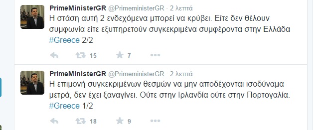 «Η μη αποδοχή ισοδύναμων μέτρων δεν έχει ξαναγίνει. Ούτε στην Ιρλανδία ούτε στην Πορτογαλία. Πουθενά! Αυτή η περίεργη στάση δύο ενδεχόμενα μπορεί να κρύβει. Είτε δεν θέλουν συμφωνία είτε εξυπηρετούν συγκεκριμένα συμφέροντα στην Ελλάδα», είπε ο Πρωθυπουργός σε συνεργάτες του σύμφωνα με κυβερνητική πηγή.