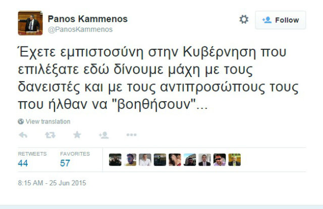 «Έχετε εμπιστοσύνη στην κυβέρνηση που επιλέξατε εδώ δίνουμε μάχη με τους δανειστές και με τους αντιπροσώπους τους που ήλθαν να “βοηθήσουν”…», γράφει χαρακτηριστικά.