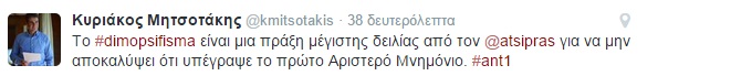 “Το δημοψήφισμα είναι μια πράξη μέγιστης δειλίας από τον @atsipras για να μην αποκαλύψει ότι υπέγραψε το πρώτο Αριστερό Μνημόνιο”.