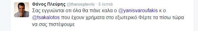 “Σας εγγυώνται οτι όλα θα πάνε καλα ο @yanisvaroufakis κ ο @tsakalotos που έχουν χρήματα στο εξωτερικό. Φέρτε τα πίσω τώρα να σας πιστέψουμε”.