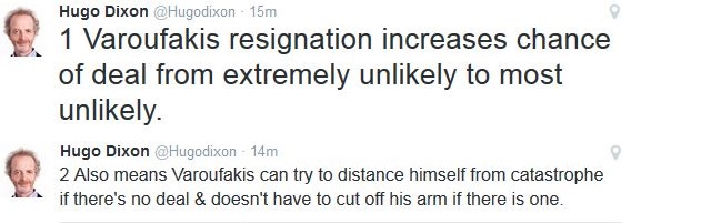 Στην πρώτη αποτίμηση της παραίτησης – αποπομπής Βαρουφάκη σχετικά με το ενδεχόμενο συμφωνίας προχώρησε μέσω Twitter o δημοσιογράφος Χιούγκο Ντίξον.