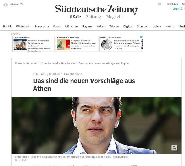 Οι προτάσεις που πρόκειται να κατατεθούν από την ελληνική πλευρά στις Βρυξέλλες είναι ίδιες με αυτές που ο ελληνικός λαός απέρριψε στο δημοψήφισμα της Κυριακής, αναφέρει η γερμανική εφημερίδα Suddeutsche Zeitung.
