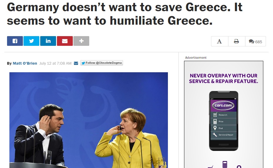 Η αμερικανική εφημερίδα Washington Post, στη διαδικτυακή της έκδοση, ανάρτησε άρθρο με τίτλο “Η Γερμανία δεν θέλει να σώσει την Ελλάδα. Φαίνεται ότι θέλει να εξευτελίσει την Ελλάδα”.