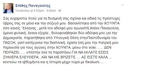 Μετά και από αυτό στοχοποιήθηκε από ξέφρενους διαδικτυακούς “επαναστάτες” του πληκτρολογίου. Μην μπορώντας να συγκρατήσει τη συναισθηματική του φόρτιση, ο Στάθης Παναγούλης έγραψε στο Facebook: