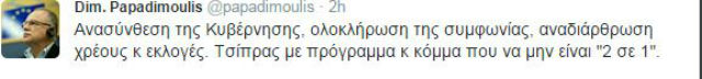 «Ανασύνθεση της Κυβέρνησης, ολοκλήρωση της συμφωνίας, αναδιάρθρωση χρέους και εκλογές. Τσίπρας με πρόγραμμα και κόμμα που να μην είναι “2 σε 1″», έγραψε συγκεκριμένα ο κ. Παπαδημούλης.